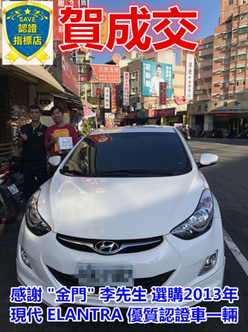 成交見證:賀成交 感謝金門 李先生 選購2013年現代 ELANTRA 1.8 白 謝謝您給我們一次能為您服務的機會, 謝謝您的信任與支持